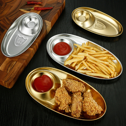 Plato de acero inoxidable para patatas fritas, plato de especias dividido ovalado, platos para aperitivos, patatas fritas, 2 compartimentos, bandeja para servir